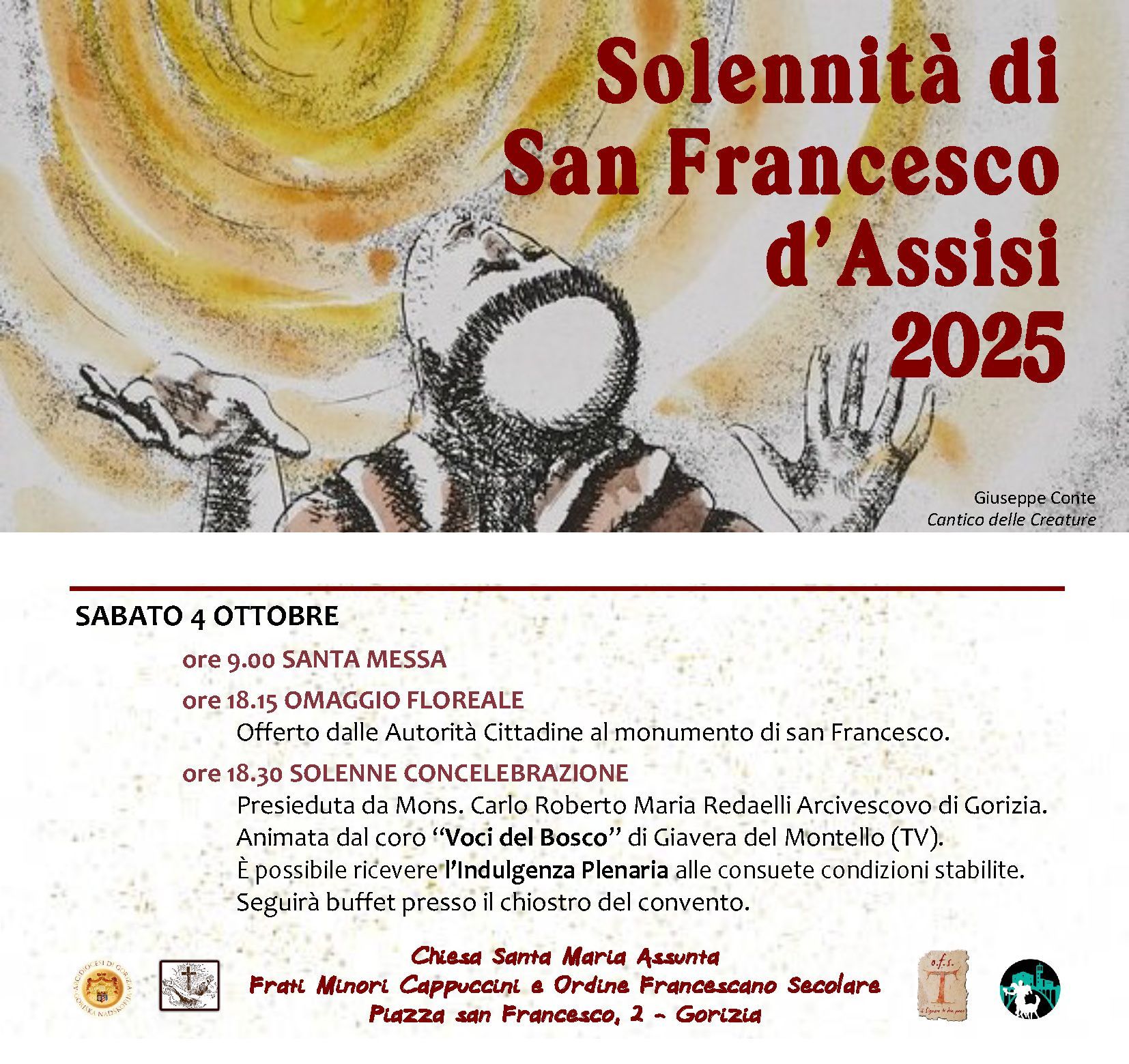 🗓️ SABATO 4 OTTOBRE 2025Voce di elenco 4⏰ ore 18:30 📍 Gorizia (GO) ⛪ Chiesa di Santa Maria Assunta dei Frati Cappuccini 🎶 Animazione Liturgica e Concerto in onore di San Francesco d'Assisi