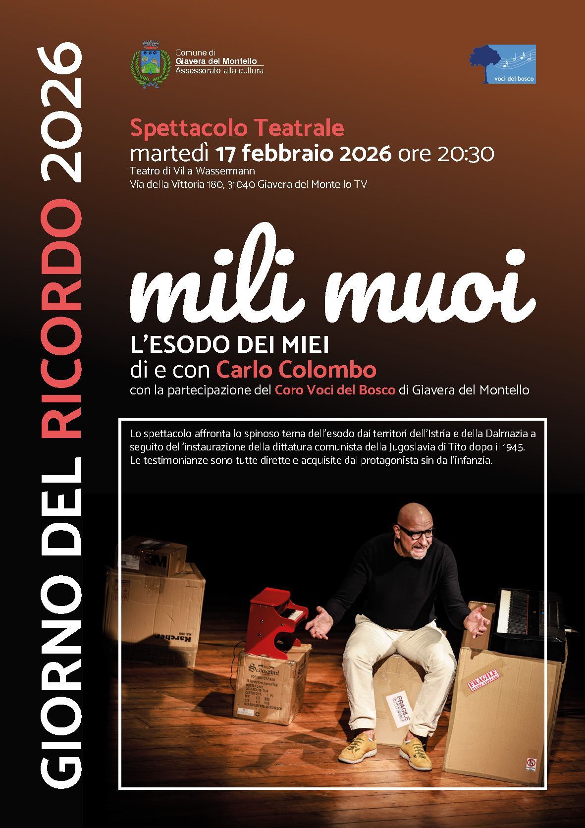 A „Voci del Bosco” egyszerű lelkű, szenvedélyes hangok. Egy népi ihletésű együttes, amely huszonöt évvel ezelőtt alakult a Treviso tartományban található Montello dombjai között, egy olyan csodálatos és szent helyen, amely a Piave folyótól a Monte Grappa hegyig terjed. A természetről, az egyszerűségről, a szerelemről és a reményről énekel. A kórus számos koncertet adott Olaszországban és külföldön, mindig arra törekedve, hogy új költészettel hangolja össze hallgatói szívét, történeteit egyszerűen és soha nem hivalkodva mesélve el. A repertoár, amely főként élő szerzők műveiből áll, az elmúlt években gazdagodott Gianluca Valle, a kórus vezetőjének és karmesterének érzékeny és finom tollából származó új dalokkal, amelyek iránt a kórus tagjai megújult érzelmeket táplálnak. Ezeket az érzelmeket más kórusok is megosztják, mind Olaszországban, mind külföldön, így a „Voci del Bosco” egy ritka példája lett az „szerzői kórusnak”.